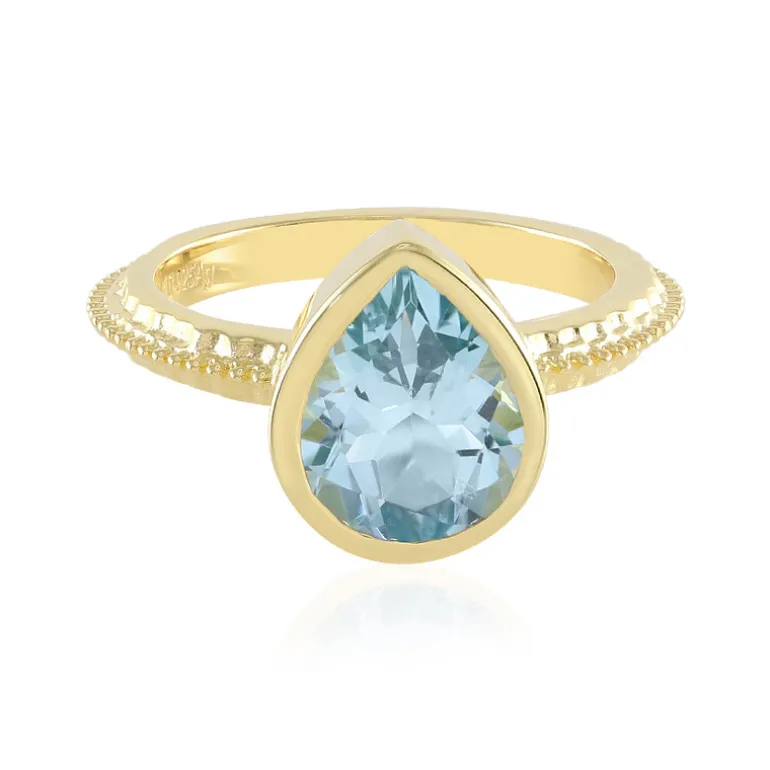 Erleben Sie Eleganz mit einem Hauch von heiterem Himmelblau. Dieser Ring aus vergoldetem Sterlingsilber präsentiert einen schillernden brasilianischen Himmelblauen Topas mit 2,365 Karat. Der tropfenförmige Schliff des Edelsteins fängt das Licht perfekt ein und sorgt für ein faszinierendes Funkeln. Mit einer Kopfgröße von 23×21 mm und einem ungefähren Silbergewicht von 2,89 g ist dieses Stück ein kühnes Statement der Raffinesse. Er ist ideal für die Eleganz des Tages oder den Glamour des Abends und passt in jede Umgebung.