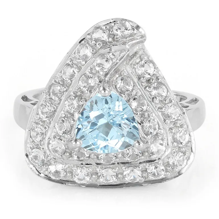 Dieser exquisite himmelblaue Topasring aus Sterlingsilber präsentiert einen atemberaubenden brasilianischen Topas im Billionenschliff von 1,4 Karat. Das Herzstück ist von 30 runden weißen Topasen im Brillantschliff umgeben, die zusammen ein Karatgewicht von 2,587 Karat ergeben. Dieser Ring ist ideal für besondere Anlässe oder für den eleganten Alltag. Er passt sowohl zu formellen als auch zu legeren Outfits und ist somit eine vielseitige Ergänzung für jede Schmucksammlung.