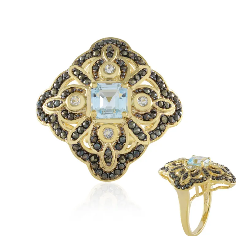 Dieser atemberaubende Ring zeigt einen bezaubernden himmelblauen Topas aus Brasilien, der wunderschön in vergoldetes 925er Sterlingsilber gefasst ist. Mit Markasit-Akzenten geschmückt, strahlt er Eleganz und Charme aus. Perfekt für besondere Anlässe oder als luxuriöses Accessoire für den Alltag. Dieses kunstvoll gestaltete Schmuckstück ist eine wunderbare Ergänzung für jede Schmucksammlung.