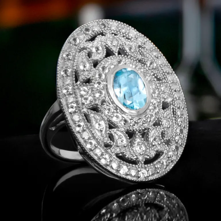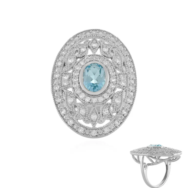 Entdecken Sie die Anziehungskraft dieses himmelblauen Topasrings, der einen brasilianischen Edelstein von 1,302 Karat mit ovalem Schliff enthält, der von einem Kranz aus 56 funkelnden weißen Topasen umgeben ist. Der Ring ist aus platiniertem 925er Sterlingsilber gefertigt und hat ein Gesamtgewicht von 2,31 Karat. Mit einer Größe von 23×22 mm ist er ein Highlight, das sich perfekt für Cocktailabende eignet oder einen Hauch von Raffinesse in Ihren Alltag bringt. Kombinieren Sie ihn mit dezenten Silberaccessoires, um seinen bezaubernden Farbton und sein raffiniertes Design zu betonen.