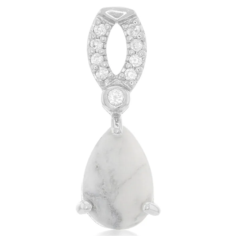 Entdecken Sie die eisige Eleganz dieses Anhängers aus kanadischem Howlite. Mit einem tropfenförmigen Cabochon von 3,24 Karat, gefasst in glänzendem 925er Sterlingsilber, ist dieser Tropfenanhänger ein Beweis für zeitlosen Stil. Verziert mit kambodschanischen Zirkon-Akzenten von insgesamt 0,240 Karat, verleiht er Ihrem Ensemble ein subtiles Funkeln. Er eignet sich sowohl für einen legeren Brunch als auch für ein formelles Abendessen und ist eine vielseitige Ergänzung Ihrer Schmucksammlung.