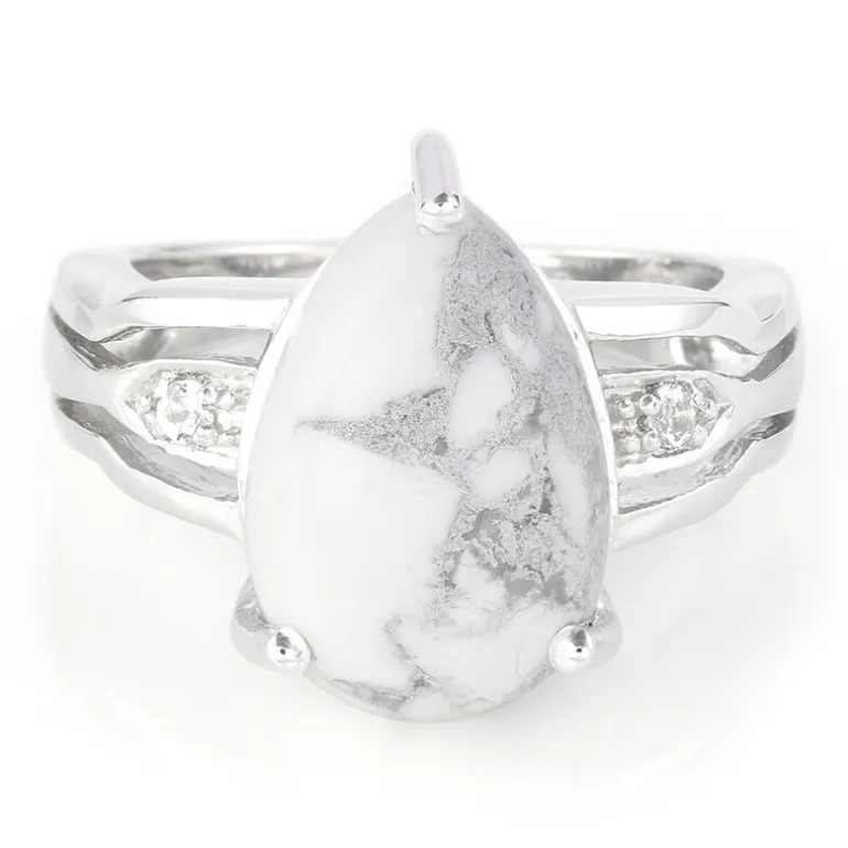 Entdecken Sie die ruhige Schönheit dieses exquisiten Rings aus kanadischem Howlite, der durch zwei funkelnde brasilianische Weißtopase ergänzt wird. Das Herzstück des Rings ist ein 6,23 Karat großer tropfenförmiger Howlite-Cabochon, der in 925er Sterlingsilber mit einem Gesamtgewicht von ca. 3,93 Gramm gefasst ist. Das moderne Design des Rings mit den Maßen 27×22 mm bringt die einzigartigen marmorierten Muster des Edelsteins zur Geltung und macht ihn zu einem perfekten Schmuckstück. Kombinieren Sie diesen stilvollen Ring mit Ihren Lieblingsoutfits für einen Hauch von schlichter Eleganz, ideal sowohl für legere als auch für formelle Anlässe.