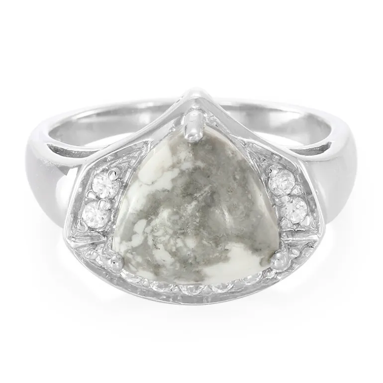 Entdecken Sie die schlichte Eleganz dieses Rings aus Sterlingsilber, gekrönt von einem dreieckigen Cabochon aus kanadischem Howlite. Der 3,91 Karat schwere Hauptstein wird von funkelnden Zirkonen aus Kambodscha mit insgesamt 0,39 Karat in einer eleganten Fassung ergänzt. Die harmonische Mischung aus kühlen Weiß- und Grautönen im Howlite kontrastiert vorzüglich mit dem hellen Silber und macht diesen Ring zu einem vielseitigen Schmuckstück, das sich sowohl für zwanglose Brunchs als auch für anspruchsvolle Abendveranstaltungen eignet. Das 925er Sterling Silberband mit einem Gewicht von ca. 3,95 g garantiert Langlebigkeit und Stil.
