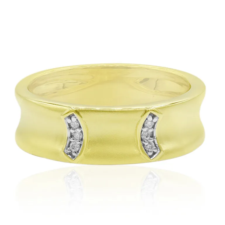 Dieser schimmernde Ring aus vergoldetem 925er Sterlingsilber bezaubert mit sechs Diamanten der Klasse I1 von insgesamt 0,032 Karat. Sein einzigartiges, breites Banddesign mit fachmännisch eingefassten Brillanten im Rundschliff setzt ein modernes und kühnes Statement. Dieser Ring eignet sich perfekt für modische Ensembles und verleiht sowohl legeren als auch formellen Outfits einen Hauch von Eleganz, was ihn zu einer idealen Wahl für verschiedene Anlässe macht.