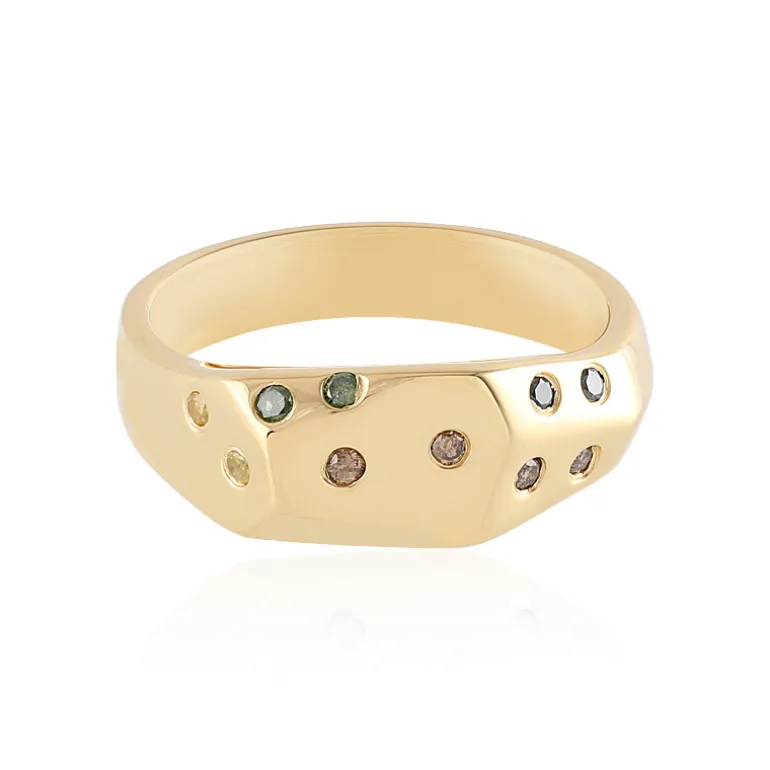 Dieser Ring aus vergoldetem 925er Sterlingsilber bietet eine schillernde Vielfalt an Farben und Glanz. Er ist mit I2-Diamanten in gelben, schokoladenfarbenen, blauen und grünen Tönen besetzt, von denen jeder 0,024ct wiegt und einen runden Brillantschliff aufweist. Das Gesamtkaratgewicht dieses Schmuckstücks beträgt 0,12 ct, eingefasst in ein 5,51 g schweres Band, das bei jeder Drehung elegant das Licht einfängt. Dieser Ring ist ideal für alle, die einen Hauch von Skurrilität in ihrer Garderobe zu schätzen wissen, und lässt sich nahtlos von der Bürokleidung bis zum Abendoutfit tragen.
