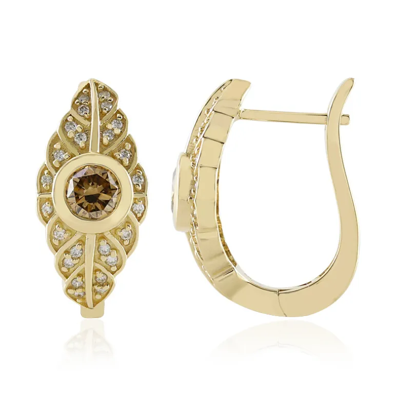 Schmücken Sie Ihre Ohren mit dem Funkeln champagnerfarbener Diamanten, umhüllt vom prächtigen Glanz von 14 Karat Gelbgold. Diese eleganten Reif-Ohrringe bestehen aus einem Paar champagnerfarbener Diamanten mit einem Gesamtgewicht von 0,9 ct., die von 48 Diamanten mit einer Reinheit von SI2 in verschiedenen Gewichtsklassen akzentuiert werden, was ein Gesamtkaratgewicht von 1,138 ct ergibt. Der runde Brillantschliff unterstreicht die natürliche Ausstrahlung des Steins und macht diese Ohrringe zu einer zeitlosen Ergänzung für jede Kollektion. Sie eignen sich perfekt für gehobene Anlässe oder als luxuriöses Accessoire für den Alltag und passen sowohl zu legerer als auch zu formeller Garderobe.