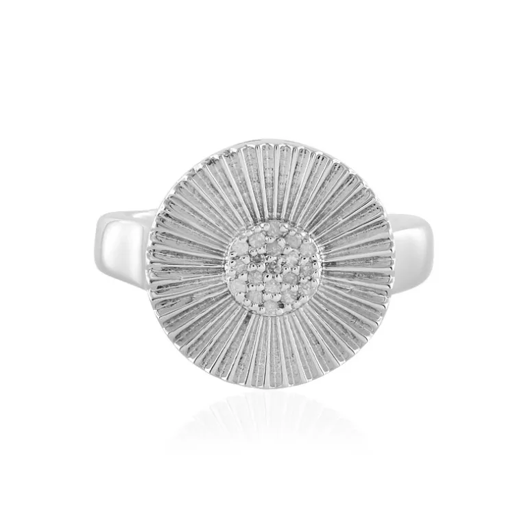 Entdecken Sie das Funkeln unseres Diamantrings Radiant mit 19 Diamanten der Reinheit I2 von insgesamt 0,086 ct. Dieser Ring mit einem Gewicht von ca. 5,92 g ist in Sterlingsilber gefasst und mit einem hochglänzenden Platin-Finish versehen. Sein Design erinnert an einen Sonnenschliff und macht ihn zu einem Statement-Stück, das sich sowohl für den Tag als auch für den eleganten Abend eignet. Kombinieren Sie diese zeitlose Schönheit mit Ihrem Lieblingscocktailkleid oder verleihen Sie Ihrem Büroensemble einen Hauch von Luxus.