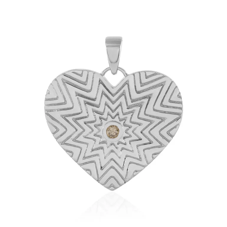 Dieser herzförmige Anhänger ist ein bezauberndes Accessoire mit einem champagnerfarbenen Diamanten von 0,091 Karat in der Mitte, der von platiniertem 925er Sterlingsilber glänzend umschlossen wird. Mit seinem modernen geometrischen Starburst-Muster verleiht er jedem Outfit einen dynamischen Touch. Ob tagsüber elegant oder abends elegant, dieser Anhänger ist vielseitig genug für verschiedene Anlässe. Das subtile Funkeln des Champagner-Farbtons wertet Ihr Ensemble sanft auf und macht ihn perfekt für alle, die dezenten Luxus schätzen.
