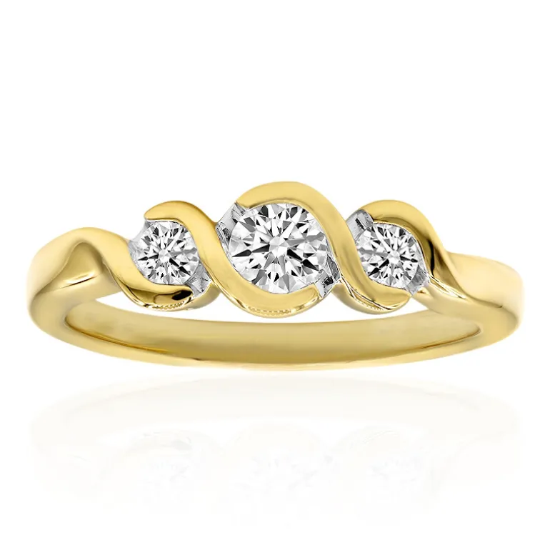 Entdecken Sie diesen eleganten Ring aus 14-karätigem Gold mit zwei lupenreinen Diamanten (IF) mit einem Gesamtgewicht von 0,42 Karat. Der zentrale Stein mit rundem Brillantschliff ist etwa 4 mm groß und wird von zwei 2,8 mm großen Diamanten flankiert, die jeweils einen Tanz des Lichts vollführen. Die sanften Kurven des Bandes bringen das Funkeln dieser exquisiten Steine noch besser zur Geltung. Dieser Ring eignet sich perfekt für Feierlichkeiten oder als auffällige Ergänzung zu Ihrem Alltagsoutfit und verleiht jedem Outfit Raffinesse.