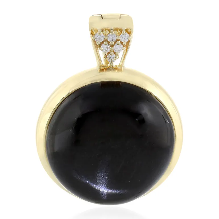 Wir präsentieren unseren bezaubernden Indian Star Diopsid-Anhänger, bei dem die traditionelle Cabochon-Form auf modernen Luxus trifft. Der runde, 17 mm große Edelstein in prächtigem 9K-Gelbgold mit einem Gewicht von ca. 3,43 g hat großzügige 22,906 Karat und wird von einer Konstellation aus sechs brillanten SI-Diamanten von insgesamt 0,048 Karat hervorgehoben. Das Varioclip-Design des Anhängers sorgt für Vielseitigkeit und einfaches Tragen mit verschiedenen Ketten. Dieser Anhänger eignet sich sowohl für elegante Anlässe als auch für den Alltag und ist eine zeitlose Bereicherung für jede Schmucksammlung.