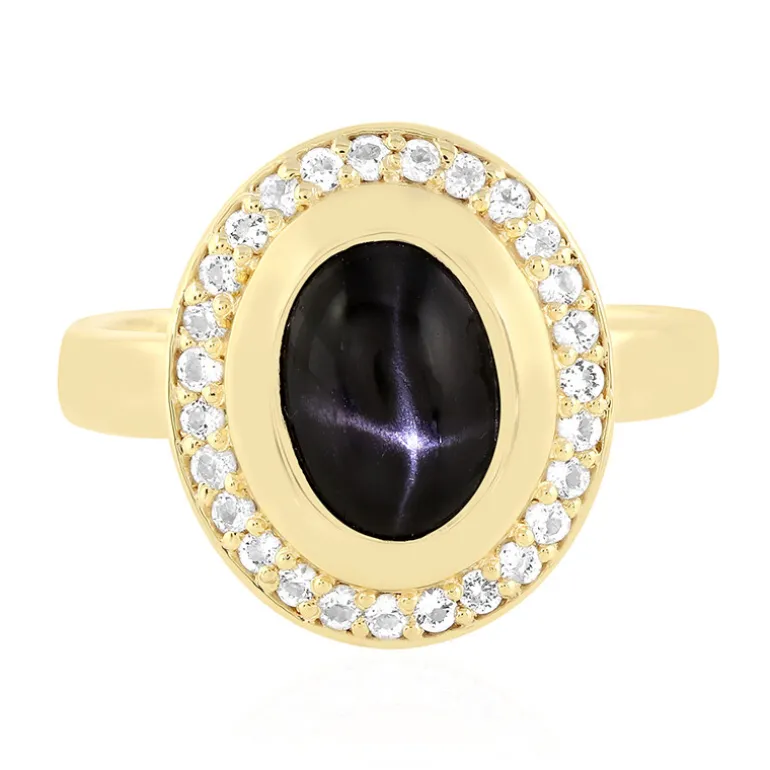Entdecken Sie die Anziehungskraft dieses bezaubernden Star-Diopside-Rings, der aus Indien stammt und einen ovalen Cabochon von 2,457 Karat präsentiert. Der zentrale Stein ist von einem Halo aus 27 strahlenden weißen Topasen aus Madagaskar von insgesamt 0,246 Karat umgeben. Gefertigt aus hochwertigem 925er Sterlingsilber mit einer exquisiten Goldplattierung, strahlt dieser Ring Raffinesse aus. Der Kontrast zwischen dem dunklen Edelstein und der hellen Umrandung macht ihn zu einem auffälligen Schmuckstück, das sich ideal für Abendveranstaltungen oder besondere Anlässe eignet.