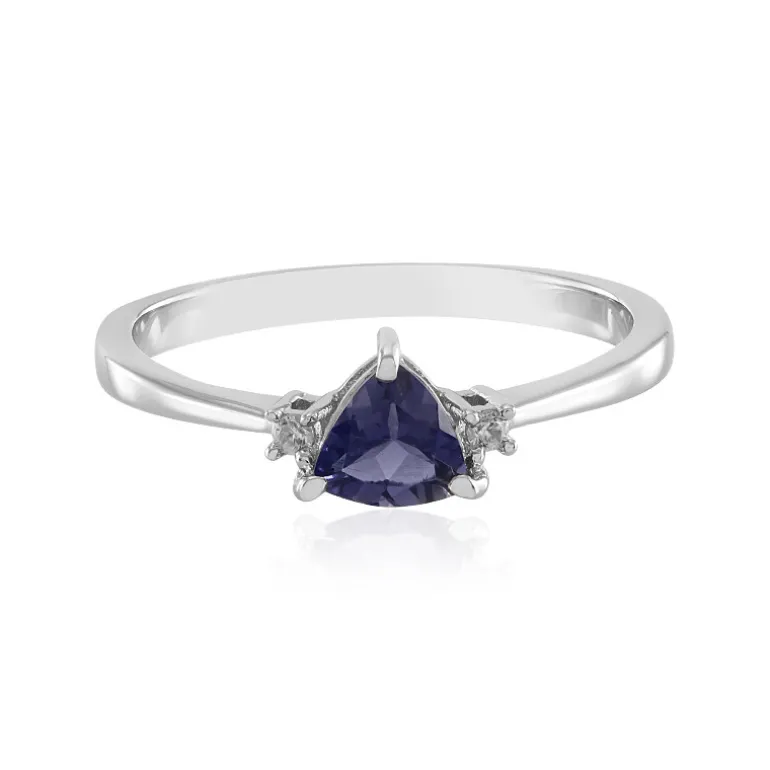 Dieser raffinierte Ring präsentiert einen fesselnden indischen Iolith im Trillant-Schliff mit 0,567 ct und einer Größe von ca. 6 mm. Flankiert von zwei schimmernden kambodschanischen Zirkonen von insgesamt 0,065 ct, die jeweils einen runden Schliff von etwa 1,8 mm aufweisen. Der Ring ist aus hochwertigem 925er Sterlingsilber mit Platinveredelung gefertigt und wiegt ca. 2,12 g. Mit seinem eleganten Design und den Maßen 23×19 mm ist der Ring perfekt geeignet, um sowohl legeren als auch formellen Ensembles einen Hauch von königsblauer Eleganz zu verleihen.