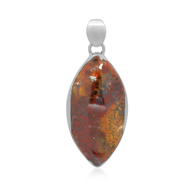 Entdecken Sie die bezaubernde Schönheit Indonesiens mit diesem marquise-cabochonförmigen Anhänger aus Java Leaf Achat. Gefertigt aus hochwertigem 925er Sterlingsilber mit einer exquisiten Platinbeschichtung, wiegt dieses Stück etwa 2,2 g und präsentiert einen 20-karätigen Edelstein, der mit seiner Größe von 44 x 19 mm Eleganz verkörpert. Die blattähnlichen Muster und die warmen Farbtöne machen diesen Anhänger zu einem vielseitigen Accessoire für jedes Outfit. Er eignet sich perfekt, um Ihrem Alltagslook einen Hauch von Raffinesse zu verleihen oder als Statement-Stück für besondere Anlässe.