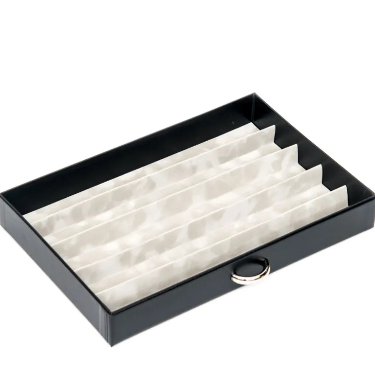 Entdecken Sie eine elegante Art und Weise, Ihre wertvollen Halsketten mit diesem raffinierten Tablett zu präsentieren. Das elegante schwarze Design mit samtgefütterter Innenseite sorgt dafür, dass jedes Schmuckstück vor einem weichen Hintergrund zur Geltung kommt. Mit den Maßen 29 x 19 x 3,8 cm hat es die perfekte Größe für persönliche Sammlungen oder die Präsentation in Boutiquen. Dieses Tablett eignet sich sowohl für lässige Accessoires als auch für Ihre wertvollsten Ketten und ist eine stilvolle Ergänzung für jede Kommode oder jeden Tresen.