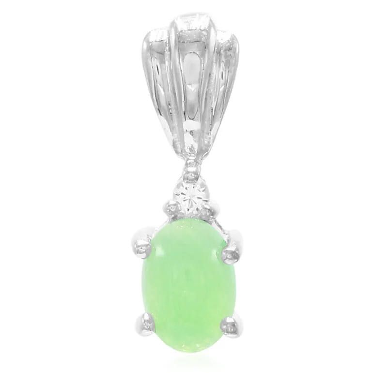 Dieser exquisite australische Chrysopras-Anhänger ist ein echter Hingucker. Der ovale Cabochon ist in 925er Sterlingsilber gefasst und wird durch einen runden weißen Topas im Brillantschliff aus Brasilien wunderbar ergänzt. Dieses Schmuckstück eignet sich sowohl für legere als auch für formelle Anlässe und wertet mit seinem klassischen Charme und seiner subtilen Raffinesse mühelos jedes Outfit auf. Perfekt, um einen Hauch von Luxus in Ihre Schmucksammlung zu bringen.