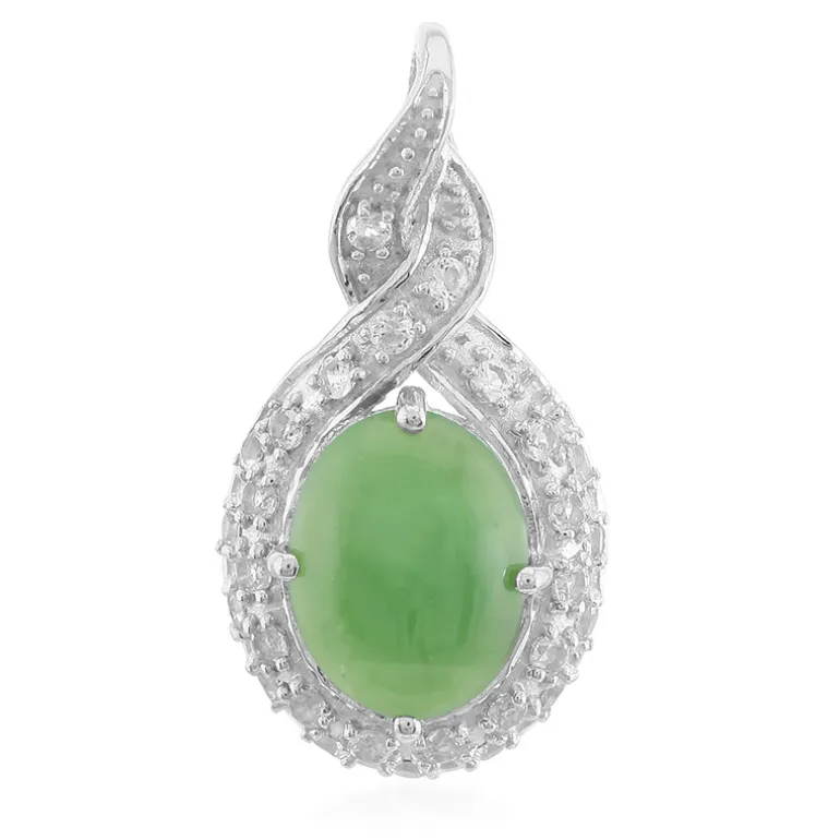 Entdecken Sie die Eleganz dieses Imperial Chrysopras Silberanhängers mit einem ovalen Cabochon von 0,92 Karat, der aus Australien stammt. Der sattgrüne Stein wird von 28 weißen Topas-Edelsteinen wunderbar ergänzt, die einen funkelnden Heiligenschein bilden. Dieses raffinierte Schmuckstück aus 925er Sterlingsilber eignet sich sowohl für legere als auch für formelle Anlässe. Kombinieren Sie ihn mit einer schlichten Halskette für einen raffinierten Touch zu jedem Outfit.