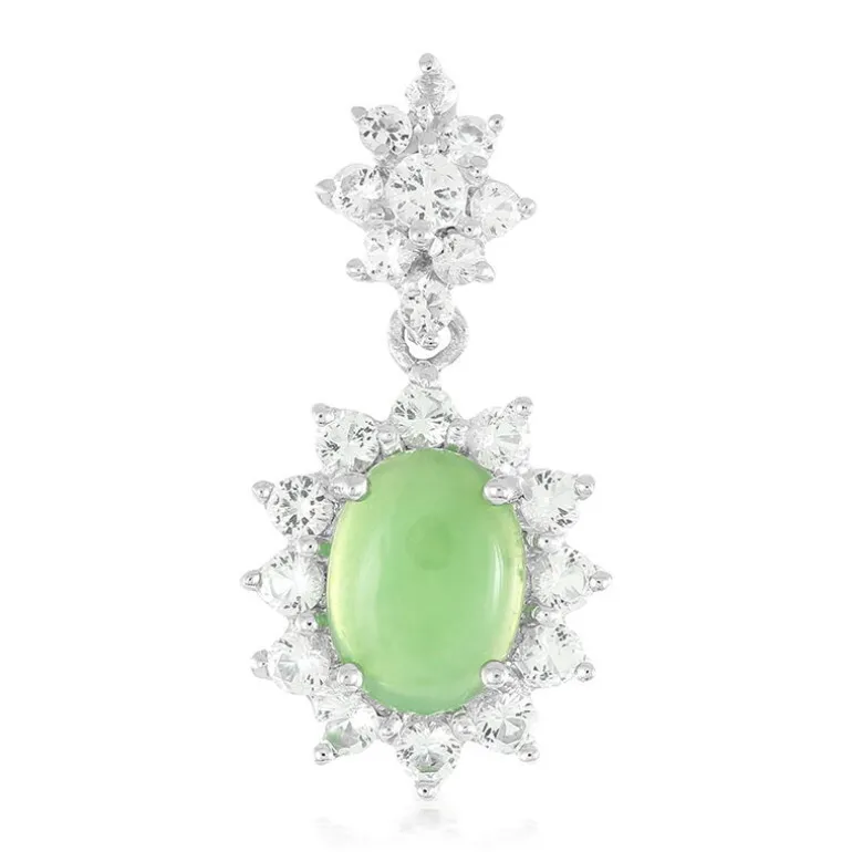 Dieser exquisite Anhänger besteht aus einem ovalen Chrysopras-Cabochon aus Australien, der von funkelnden brasilianischen Weißtopas-Edelsteinen umgeben ist. Er ist in glänzendes 925er Sterlingsilber gefasst und eignet sich perfekt, um jedem Ensemble einen Hauch von Eleganz zu verleihen. Er eignet sich sowohl für formelle als auch für legere Anlässe. Tragen Sie ihn zu einer schlichten Bluse oder einem eleganten Abendkleid, um sein atemberaubendes Design zu präsentieren.
