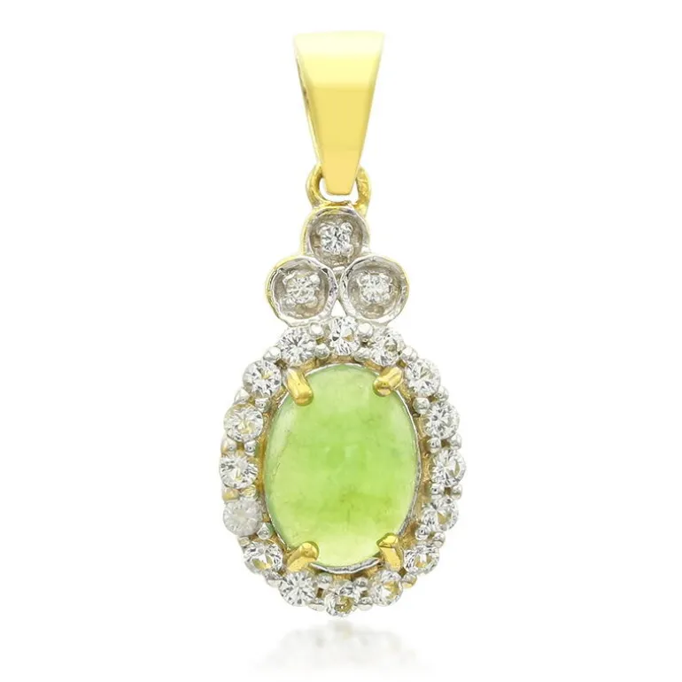 Dieser atemberaubende Anhänger besteht aus einem ovalen Chrysopras-Cabochon aus Australien, der von funkelnden weißen Topas-Edelsteinen aus Brasilien eingerahmt wird. Das aus vergoldetem 925er Sterlingsilber gefertigte Schmuckstück strahlt Eleganz und Raffinesse aus. Er eignet sich sowohl für legere als auch für formelle Anlässe und verleiht jedem Outfit einen Hauch von Luxus. Kombinieren Sie es mit einer einfachen Kette, um seine Schönheit zur Geltung zu bringen.