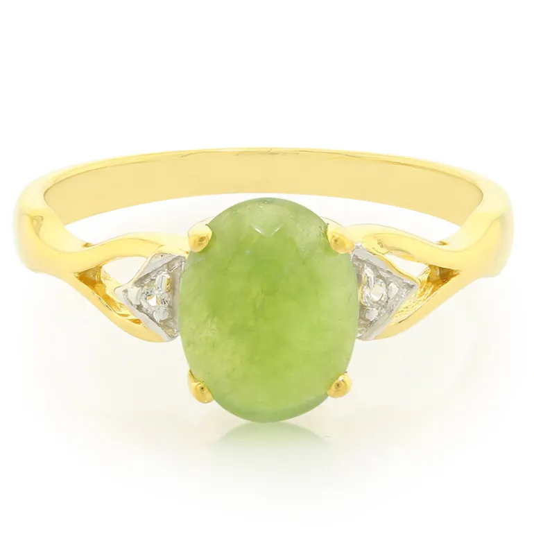 Entdecken Sie die leuchtende Anziehungskraft des australischen Chrysopras in diesem Ring aus vergoldetem 925er Sterlingsilber. Mit einem ovalen Cabochon von 1,03 Karat strahlt dieser Edelstein einen lebendigen grünen Farbton aus, der die Essenz des Frühlings einfängt. Flankiert von zwei weißen Topas-Edelsteinen im Brillantschliff, verbindet dieses Schmuckstück auf elegante Weise Lebendigkeit mit Raffinesse. Eine exquisite Wahl für formelle Anlässe oder ein zusätzliches Funkeln für Ihren täglichen Auftritt. Kombinieren Sie ihn nahtlos mit Pastell- oder Erdtönen, um seinen natürlichen Charme zu akzentuieren.