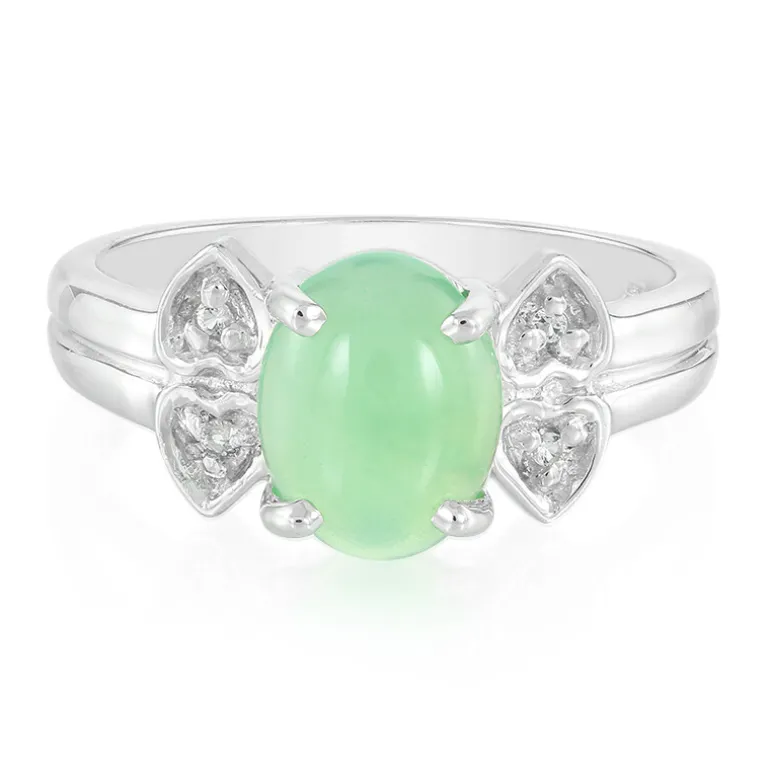 Zeigen Sie zeitlose Eleganz mit diesem Ring aus 925er Sterlingsilber, der mit einem ovalen australischen Imperial Chrysopras im Cabochon-Schliff von 1,3 Karat besetzt ist, flankiert von funkelnden weißen Topasen von insgesamt 0,021 Karat. Der wunderschöne pastellgrüne Farbton des Hauptedelsteins wird durch die schimmernde Brillanz der Topase ergänzt, die in einem raffinierten Design mit den Maßen 24 x 20 mm gefasst sind. Dieser Ring eignet sich perfekt, um Ihrem Ensemble einen Hauch von heiterer Raffinesse zu verleihen, und wird bei jeder Gelegenheit Bewunderung hervorrufen.