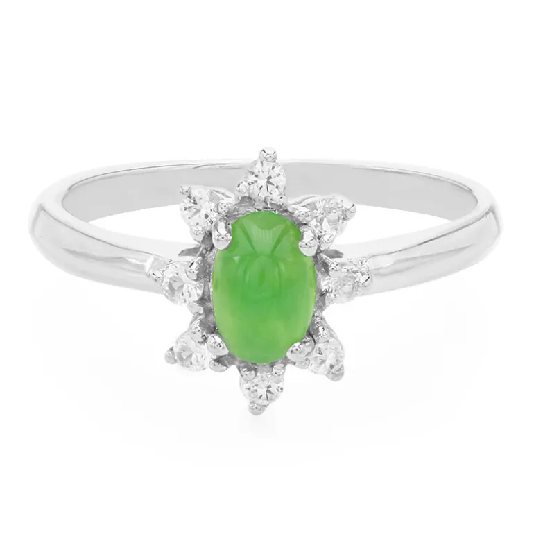 Entdecken Sie die lebendige Anziehungskraft dieses atemberaubenden Rings mit einem australischen Chrysopras im eleganten ovalen Cabochon-Schliff mit einem Gewicht von 0,42 Karat. Der lebhafte grüne Farbton wird von acht funkelnden weißen Topasen aus Brasilien umrahmt, die zusammen 0,201 ct wiegen. Der Ring ist aus hochwertigem 925er Sterling Silber gefertigt und fühlt sich sowohl luxuriös als auch komfortabel an. Dieser Ring eignet sich perfekt, um Ihrem täglichen Outfit einen Hauch von Raffinesse zu verleihen, oder als auffälliges Accessoire für besondere Anlässe – er verspricht Bewunderung und Eleganz.