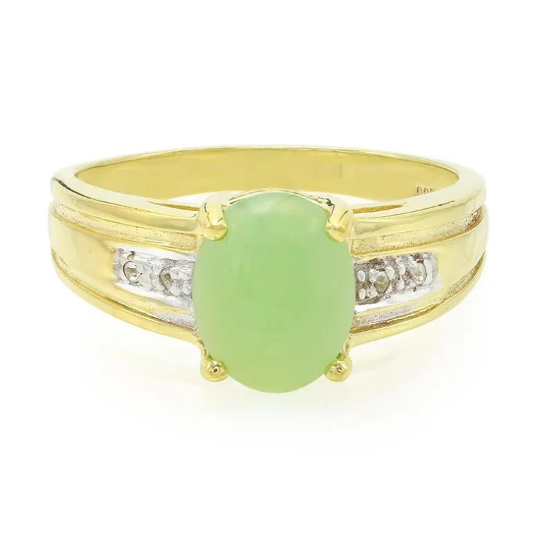 Entdecken Sie die Eleganz dieses atemberaubenden Chrysopras-Rings mit einem leuchtenden ovalen Cabochon von 0,88 Karat aus Australien, der durch vier runde weiße Topase im Brillantschliff aus Brasilien wunderbar ergänzt wird. Dieser Ring ist aus vergoldetem 925er Sterlingsilber gefertigt und strahlt Raffinesse aus. Er eignet sich sowohl für formelle Anlässe als auch für Freizeitaktivitäten und lässt sich mühelos sowohl mit Abend- als auch mit Tageskleidung kombinieren. Erhöhen Sie Ihren Stil mit einem Hauch von Luxus.