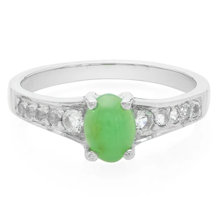 Entdecken Sie den Charme dieses Rings aus 925er Sterlingsilber, gekrönt von einem leuchtenden australischen Imperial-Chrysopras von 0,28 Karat in einem klassischen ovalen Cabochon-Schliff. Flankiert von glitzernden weißen Topasen von insgesamt 0,288 ct, zeigt dieser Ring eine Symphonie aus Glanz und Farbe. Sein elegantes Design macht ihn sowohl für den Alltag als auch für besondere Anlässe geeignet. Kombinieren Sie ihn mit Erdtönen für einen subtilen Look oder mit kontrastierenden Farben, um ihn zum Strahlen zu bringen.