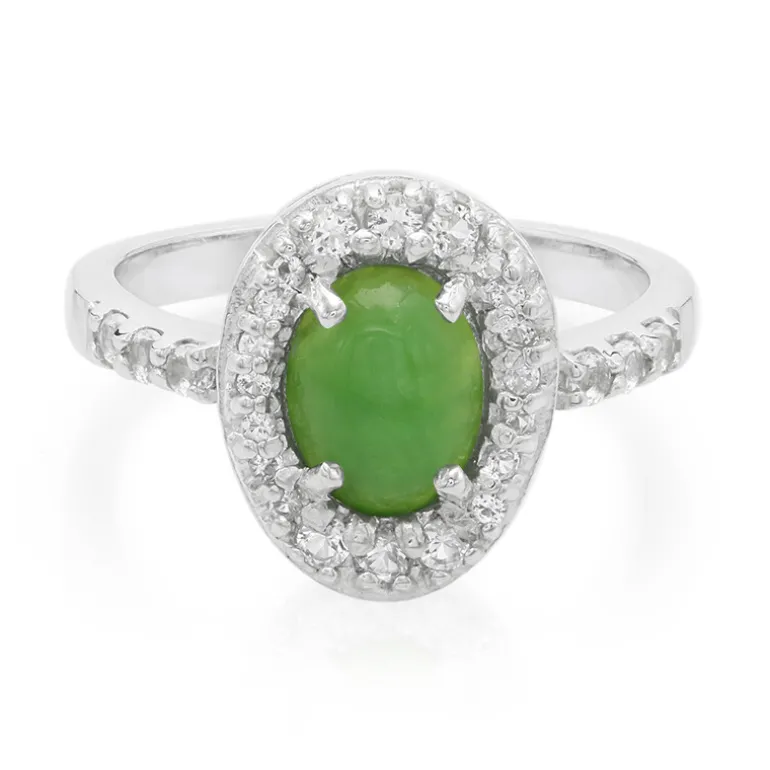 Entdecken Sie die zeitlose Schönheit des Chrysopras-Sterlingsilberrings. Der ovale Chrysopras-Cabochon von 0,74 Karat aus Australien ist mit schillernden weißen Topasen aus Brasilien verziert, die ihm ein funkelndes Finish verleihen. Perfekt für legere und formelle Anlässe, ergänzt dieser Ring jedes Outfit mit seinem lebhaften grünen Farbton und eleganten Design.