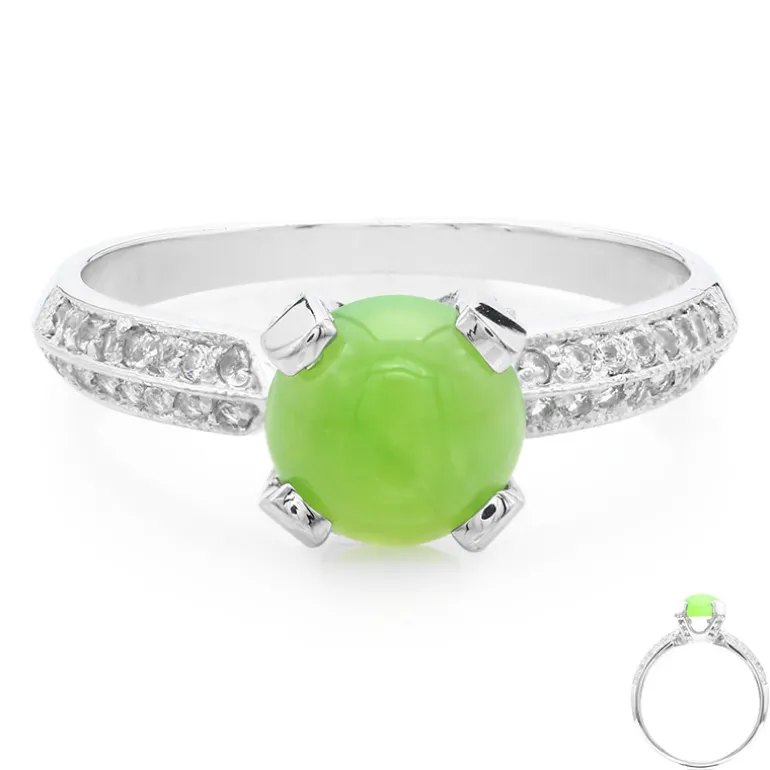 Entdecken Sie die lebendige Anziehungskraft dieses auffälligen Rings mit einem australischen Chrysopras von 0,86 Karat, gefasst in poliertem 925er Sterlingsilber. Um den bezaubernden grünen Cabochon herum sind schillernde weiße Topase aus Brasilien eingefasst, die ihm einen Hauch von Brillanz verleihen. Mit einem Gesamtgewicht von 1,075 Karat ist dieser Ring ein außergewöhnliches Schmuckstück. Er ist perfekt geeignet, um einem Freizeitoutfit einen Farbtupfer zu verleihen oder ein elegantes Abendoutfit zu ergänzen.
