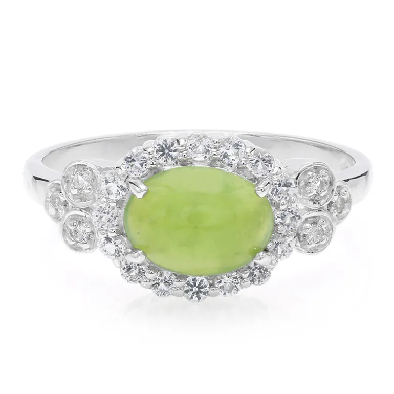 Entdecken Sie die Eleganz dieses königlichen Rings mit einem schimmernden australischen Chrysopras von 0,82 Karat, der von 0,274 Karat brasilianischem Weißtopas umrahmt wird. Die Fassung aus 925er Sterlingsilber betont den ovalen Cabochon in der Mitte des Rings und schafft einen spektakulären Kontrast zwischen dem opulenten Grün und der Brillanz der Edelsteine im Rundschliff. Dieses Schmuckstück ist ideal, um jeder Abendgarderobe einen Hauch von Raffinesse zu verleihen und verspricht, bei jeder gehobenen Veranstaltung für Gesprächsstoff zu sorgen.