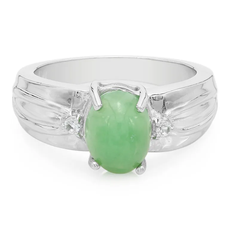 Dieser exquisite Ring besticht durch einen ovalen Chrysopras-Cabochon von 1,47 Karat aus Australien, der von zwei funkelnden weißen Topasen aus Brasilien ergänzt wird. Er ist aus 925er Sterlingsilber gefertigt und verbindet Eleganz mit Raffinesse. Dieses Schmuckstück eignet sich sowohl für formelle Anlässe als auch für den Alltag. Es lässt sich wunderbar mit gedeckten oder pastellfarbenen Outfits kombinieren und verleiht jedem Ensemble einen Hauch von raffiniertem Luxus.