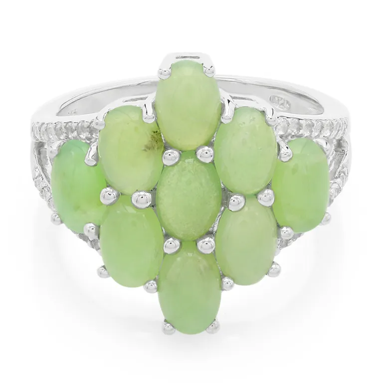 Entdecken Sie den verführerischen Charme dieses Rings aus Sterlingsilber, der von einem Cluster aus neun australischen Chrysopras-Edelsteinen von insgesamt 2,71 Karat akzentuiert wird, deren ovale Cabochon-Eleganz die Blicke auf sich zieht. Ergänzt wird das ruhige Grün durch 28 runde, brillante Weißtopase aus Brasilien, die diesem exquisiten Stück einen funkelnden Rahmen verleihen. Mit einem Gewicht von ca. 3,69 Gramm bietet die Basis aus 925er Sterlingsilber eine solide und dennoch bequeme Passform für jede Gelegenheit, von der täglichen Raffinesse bis zum glamourösen Abend. Dieser Ring lässt sich perfekt mit pastellfarbenen oder erdfarbenen Ensembles kombinieren und verleiht Ihrem Stil einen Hauch von naturinspirierter Anmut.