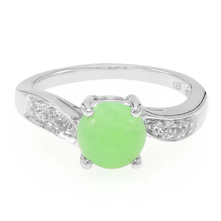 Erfreuen Sie sich an der lebendigen Anziehungskraft dieses auffälligen Silberrings mit einem australischen Chrysopras-Cabochon von 0,96 ct in der Mitte, umrahmt von glitzernden weißen Topas-Akzenten von insgesamt 0,102 ct. Dieser Ring aus hochwertigem 925er Sterling Silber wiegt etwa 2,64 Gramm und verbindet klassische Eleganz mit modernem Charme. Sein 7 mm großer runder Cabochon-Schliff strahlt königliche Raffinesse aus und eignet sich perfekt, um sowohl im Alltag als auch bei besonderen Anlässen einen Farbtupfer zu setzen.
