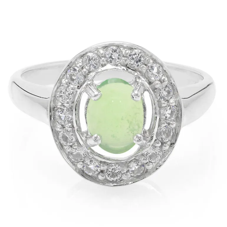 Lassen Sie sich von den frischen Farben des Frühlings verzaubern mit diesem auffälligen Ring aus Sterlingsilber. Er enthält einen australischen Chrysopras von 0,25 Karat im ovalen Cabochon-Schliff, umgeben von 16 glitzernden weißen Topasen aus Brasilien von insgesamt 0,356 Karat. Der Ring strahlt Raffinesse aus und wiegt etwa 3,09 Gramm. Er eignet sich perfekt, um Ihrem Alltagsoutfit einen Hauch von Farbe und Eleganz zu verleihen oder ein Abendoutfit zu verschönern.