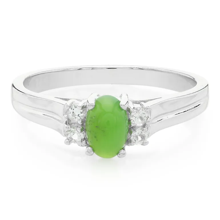 Entdecken Sie die lebhafte Anziehungskraft unseres schicken ovalen australischen Chrysopras-Rings, der mit schillernden weißen Topasen aus Brasilien akzentuiert ist. Der ovale Chrysopras-Cabochon von 0,37 Karat, eingebettet in feines 925er Sterling Silber, strahlt ein bezauberndes, lebhaftes Grün aus, eine Farbe, die sowohl zu Alltags- als auch zu Abendkleidung passt. Dieser Ring ist nicht nur ein Blickfang, sondern mit einem Gesamtkaratgewicht von 0,482 Karat auch eine bemerkenswerte Ergänzung für jede Sammlung. Er ist perfekt, um Ihrem Outfit einen Farbtupfer zu verleihen, und eignet sich sowohl für elegante Anlässe als auch für die tägliche Raffinesse.