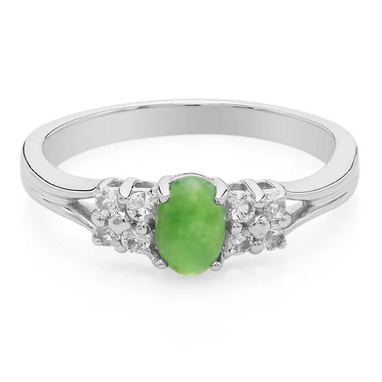Entdecken Sie die Faszination dieses Rings aus Sterlingsilber, der einen prächtigen australischen Chrysopras von 0,32 Karat im ovalen Cabochon-Schliff in einem leuchtenden Grünton präsentiert. Umgeben von einem Quartett funkelnder weißer Topase aus Brasilien auf jeder Seite, besticht dieser Ring durch seine moderne Eleganz mit einem Gesamtgewicht von 0,507 ct. Mit einem Gewicht von ca. 2,04 g bietet der Ring einen raffinierten Touch, der sich sowohl für legere als auch für formelle Anlässe eignet. Lassen Sie dieses Stück den letzten Schliff für ein schickes Ensemble oder das auffällige Statement in einem minimalistischen Outfit sein.