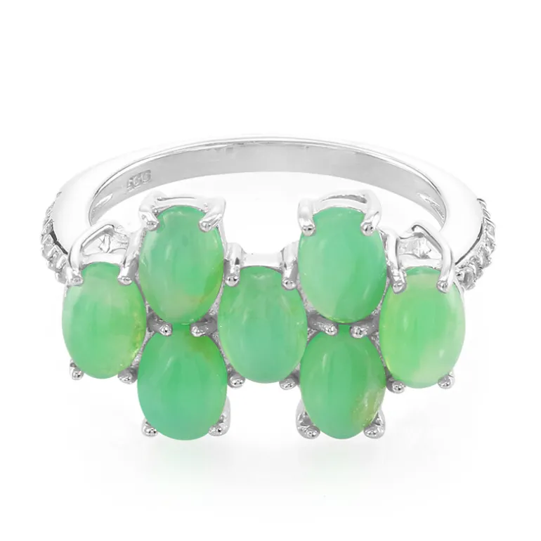 Entdecken Sie die Eleganz dieses atemberaubenden Rings mit sieben ovalen Chrysopras-Cabochons aus Australien, die durch weiße Topase aus Brasilien wunderbar ergänzt werden. Das aus 925er Sterlingsilber gefertigte Schmuckstück kombiniert leuchtendes Grün mit schimmernden Akzenten. Es eignet sich perfekt, um jedem Outfit einen Hauch von Raffinesse zu verleihen und lässt sich nahtlos von Tag zu Abend kombinieren.