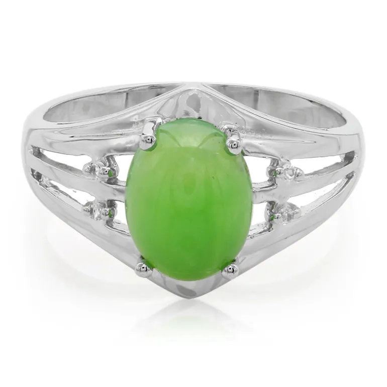 Schmücken Sie Ihre Hand mit diesem bezaubernden Ring aus 925er Sterlingsilber, der einen ovalen australischen Imperial Chrysopras im Cabochon-Schliff mit einem Gewicht von 1,22 Karat wunderschön in Szene setzt. Der leuchtend grüne Edelstein wird von vier funkelnden weißen Topasen im Brillantschliff aus Brasilien akzentuiert. Mit einem Gesamtgewicht von 1,241 Karat ist dieses exquisite Stück sowohl raffiniert als auch auffällig. Es ist eine fabelhafte Wahl sowohl für den Alltag als auch für besondere Anlässe und lässt sich nahtlos mit einer Vielzahl von Outfits kombinieren, von legerem Chic bis hin zu Abendgarderobe.