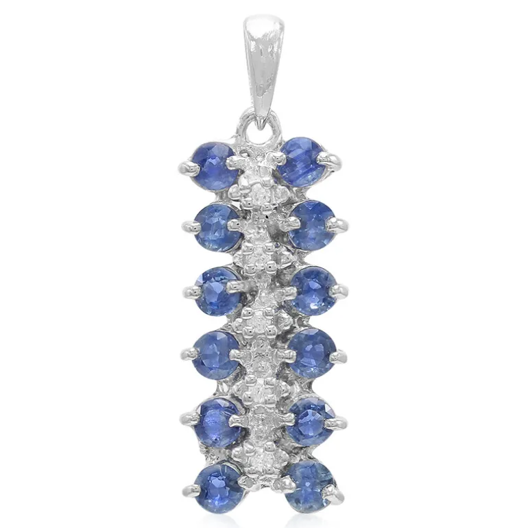Dieser auffällige Anhänger präsentiert die satte, kobaltblaue Ausstrahlung von zwölf thailändischen Kanchanaburi-Saphiren mit einem Gesamtkaratgewicht von 1,3 ct. Fachmännisch in einer klassischen runden Form geschliffen und ergänzt durch das Funkeln von fünf runden Zirkonen im Brillantschliff aus Kambodscha, glänzt dieses Stück vor dem Hintergrund von 925er Sterlingsilber, das für zusätzlichen Glanz und Haltbarkeit plattiert wurde. Sein schlankes Profil misst 29×10 mm und macht ihn zu einer geschmackvollen Ergänzung für jedes Outfit. Ob Sie an einer formellen Veranstaltung teilnehmen oder Ihre Alltagsgarderobe aufwerten, dieser Anhänger steht für zeitlose Eleganz.