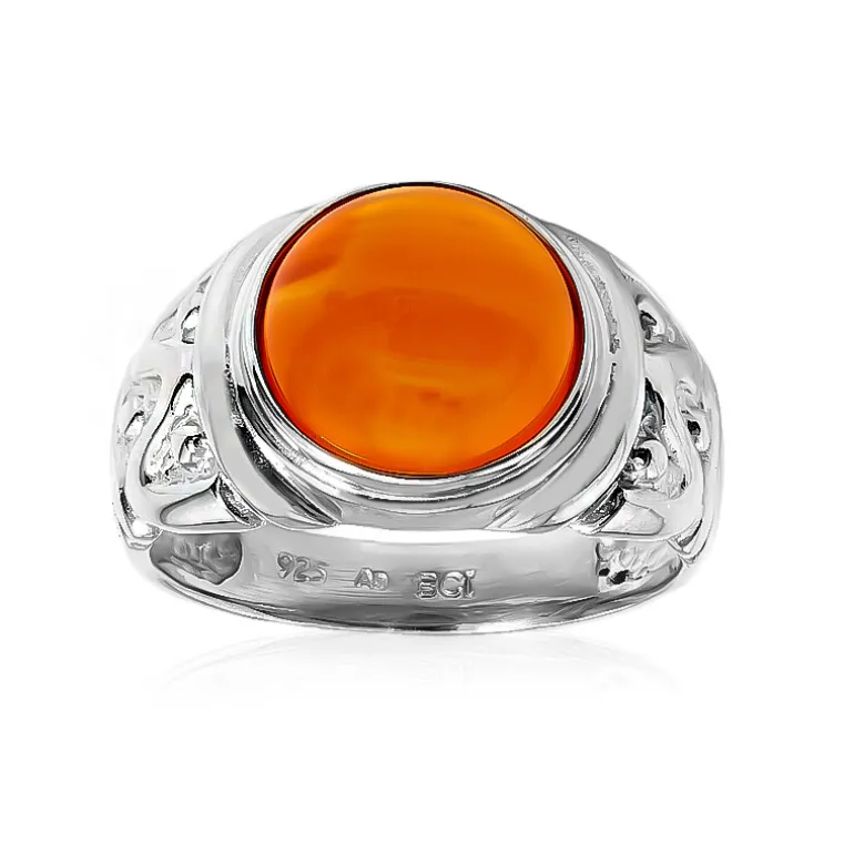 Dieser auffällige Karneol-Ring ist aus hochwertigem 925er Sterling Silber gefertigt und mit einem runden Cabochon-Stein aus Indien besetzt. Der lebhafte 3-karätige Edelstein ist in ein wunderschön verziertes Band eingefasst, das ihn zu einem echten Statement macht. Dieser Ring eignet sich sowohl für legere als auch für formelle Anlässe. Er passt perfekt zu Erdtönen oder einem schlichten schwarzen Ensemble und verleiht jedem Outfit einen Hauch von lebendiger Eleganz.