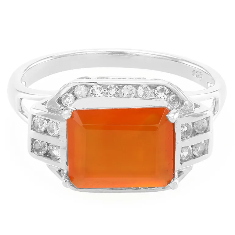 Dieser auffällige Ring präsentiert einen Karneol im Oktagon-Schliff von 1,66 Karat, der eine lebendige Wärme ausstrahlt. Umgeben von 38 funkelnden weißen Topas-Edelsteinen ist er in glänzendes 925er Sterlingsilber gefasst. Dieses Schmuckstück eignet sich sowohl für legere als auch für formelle Anlässe und verleiht jedem Outfit einen raffinierten Touch. Kombinieren Sie ihn mit neutralen Tönen, um seinen feurigen Farbton zu betonen, oder tragen Sie ihn als Statement-Stück zur Abendgarderobe, um die Blicke auf sich zu ziehen.