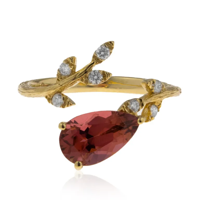 Entdecken Sie die bezaubernde Schönheit dieses Rings aus 585er Gelbgold mit einem auffälligen Neon Turmalin im Tränenschliff von 1,93 Karat aus der DR Kongo, der in ein skurriles, von Zweigen inspiriertes Band eingefasst ist. Akzentuiert mit sieben Diamanten der Reinheit I1 von insgesamt 0,152 Karat, fängt dieses Stück die Essenz der Natur mit einem luxuriösen Twist ein. Es ist ein vielseitiger Schatz für jede Schmucksammlung und eignet sich perfekt, um einem Abendkleid einen leuchtenden Farbakzent zu verleihen oder ein legeres Ensemble aufzuwerten.