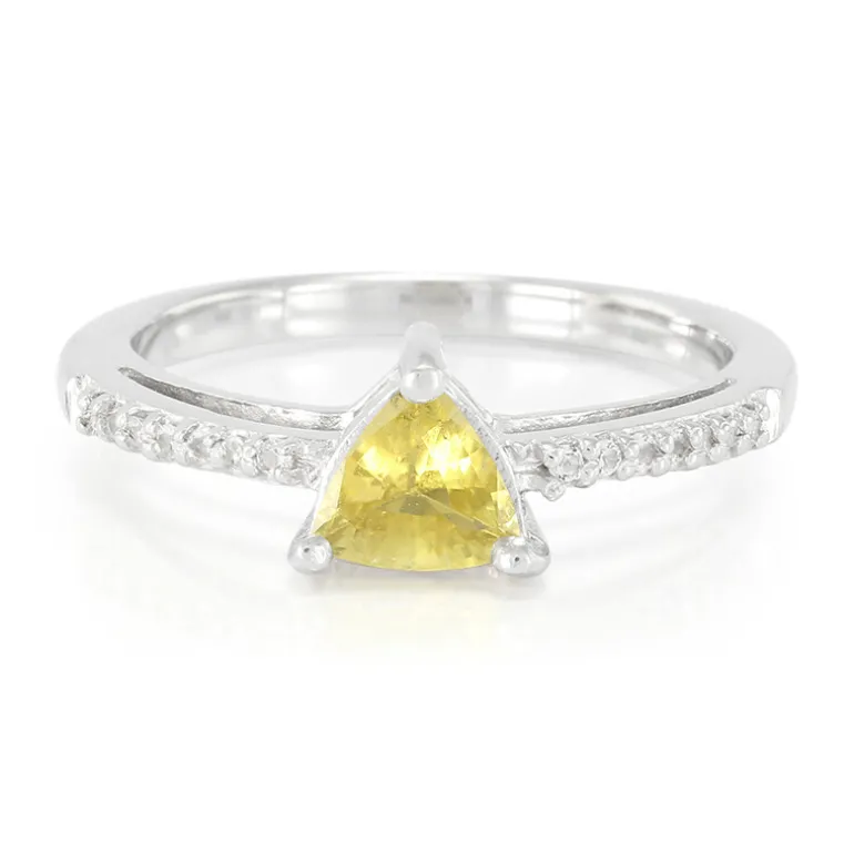 Tauchen Sie ein in die bezaubernde Welt der Edelsteine mit diesem faszinierenden Kupfer-Turmalin-Ring im Trillant-Schliff. Der aus Mosambik stammende zentrale Stein hat einen warmen, goldenen Farbton, wiegt 0,44 ct und misst etwa 5,5 mm. Er wird von einem Halo aus funkelnden weißen Topasen aus Brasilien flankiert, die dem 925er Sterlingsilberband einen Hauch von Brillanz verleihen. Mit einem Gesamtgewicht von 0,513 ct ist dieser Ring sowohl von moderner Eleganz als auch von zeitlosem Charme. Er eignet sich perfekt als Schmuck für jede Gelegenheit, von der alltäglichen Raffinesse bis zum abendlichen Glamour.