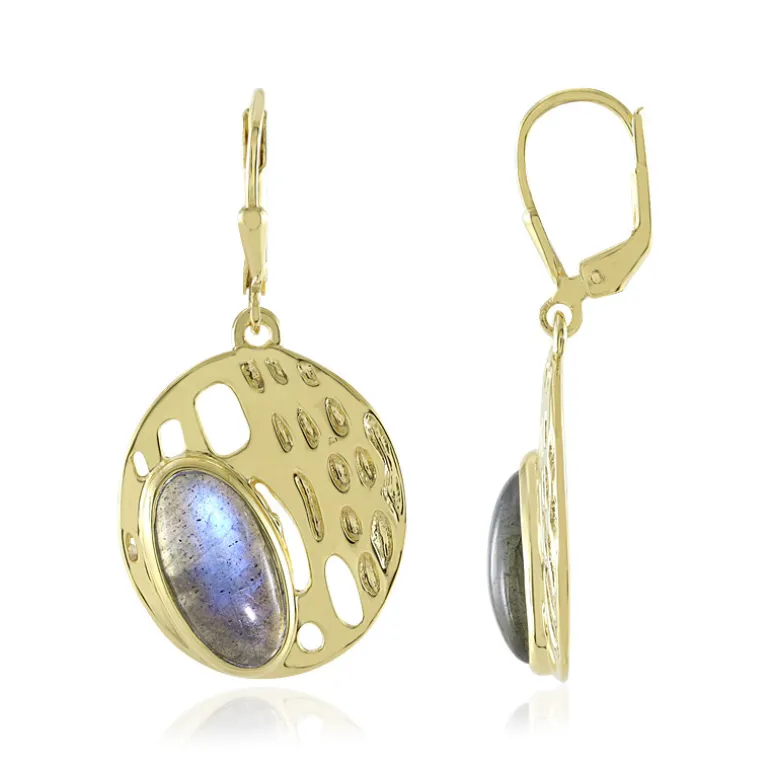 Entdecken Sie die mystische Anziehungskraft dieser Labradorit-Ohrringe aus der Monosono-Kollektion. Jedes Stück ist aus vergoldetem 925er Sterlingsilber gefertigt und mit einem ovalen Labradorit-Cabochon von 6,981 Karat aus Madagaskar besetzt. Diese Ohrringe eignen sich perfekt für die Abendgarderobe oder elegante Veranstaltungen und verleihen jedem Outfit einen Hauch von Raffinesse und Faszination. Lassen Sie sie schimmern und sorgen Sie für Gesprächsstoff bei Ihrer nächsten Zusammenkunft.