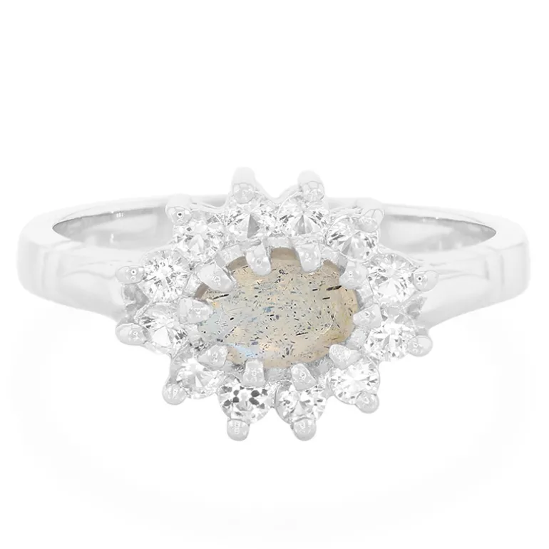 Dieser atemberaubende Ring zeigt die bezaubernde Schönheit eines Labradorits aus Madagaskar mit einem ovalen Schliff von 0,38 Karat, der das Licht auf geheimnisvolle Weise einfängt. Um diesen zentralen Stein herum sind 12 runde weiße Topase aus Brasilien im Brillantschliff mit einem Gesamtgewicht von 0,501 ct in glänzendem 925er Sterlingsilber gefasst. Mit einem Gesamtkaratgewicht von 0,881 ct ähnelt das Design dieses Rings einer strahlenden, blühenden Blume. Das Funkeln erinnert an den Morgentau und macht ihn zu einem perfekten Accessoire für den Tag und den Abend. Dieser Ring ist ein elegantes Statement, das Ihre Garderobe zu jedem Anlass ergänzt.