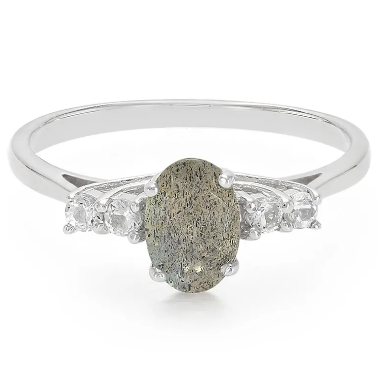 Entdecken Sie die bezaubernde Schönheit dieses Labradorit-Sterlingsilberrings mit einem faszinierenden Labradorit von 0,6 Karat im Ovalschliff aus Madagaskar, der von vier funkelnden weißen Topas-Edelsteinen akzentuiert wird. Dieser Ring strahlt eine Eleganz aus, die sowohl legere als auch formelle Outfits perfekt aufwertet. Er eignet sich ideal für Abendveranstaltungen oder verleiht Ihrem täglichen Outfit einen mystischen Touch und ist eine vielseitige Ergänzung für jede Schmucksammlung.
