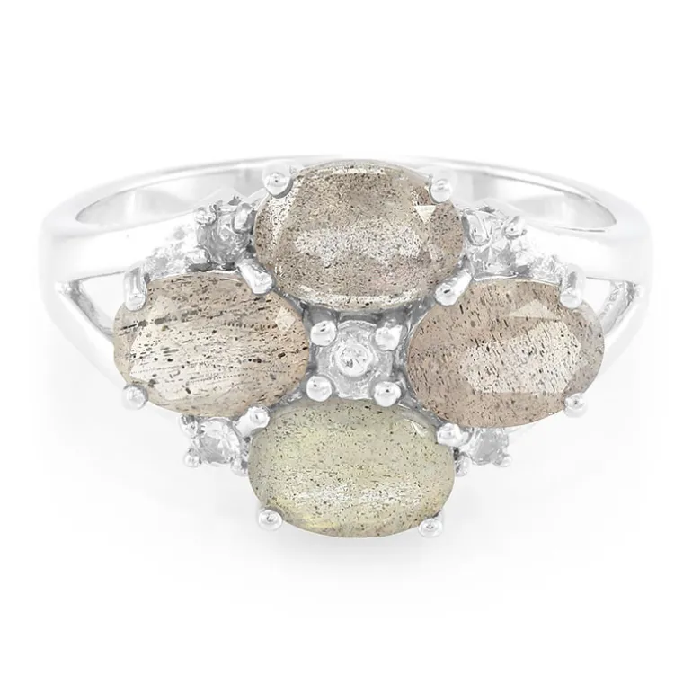 Entdecken Sie die fesselnde Anziehungskraft dieses Rings aus Sterlingsilber mit dem mystischen Schimmer eines Labradorits im Ovalschliff aus Madagaskar, ergänzt durch das Funkeln eines brasilianischen Weißtopas. Die 2,5-Karat-Labradorit-Steine werden elegant vom subtilen Schimmer zusätzlicher Weißtopas-Akzente umrahmt und machen dieses Schmuckstück zu einer poetischen Verschmelzung von erdigem Charme und raffinierter Eleganz. Dieses Schmuckstück eignet sich sowohl für den Freizeitgebrauch als auch für besondere Anlässe und verspricht, eine wertvolle Ergänzung für jede Schmucksammlung zu werden.