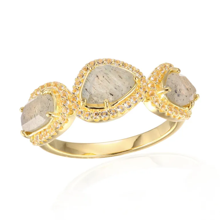 Entdecken Sie die bezaubernde Anziehungskraft dieses Rings aus vergoldetem 925er Sterling Silber, der ein Trio aus kunstvoll geschliffenen Labradoriten aus Madagaskar mit insgesamt 1,276 Karat enthält. Jeder Stein wird von einem Halo aus funkelnden weißen Topasen aus Brasilien umrahmt, die den strahlenden Charme des Rings noch verstärken. Der ausgefallene Schliff der Labradorite bringt ihr einzigartiges Farbenspiel optimal zur Geltung und macht dieses Schmuckstück zu einem echten Gesprächsanlass. Perfekt, um Ihrem Alltag einen Hauch von Eleganz zu verleihen oder für besondere Anlässe, die nach einem subtilen, aber raffinierten Accessoire verlangen.