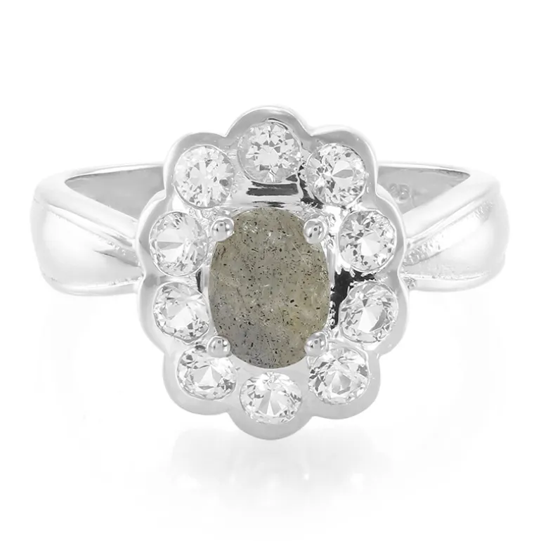 Entdecken Sie die bezaubernde Schönheit dieses Labradorit-Sterlingsilberrings. Mit einem ovalen Labradorit von 0,64 Karat aus Madagaskar, umgeben von 10 weißen Topasen im Brillantschliff aus Brasilien, glänzt dieser Ring mit einem Gesamtkaratgewicht von 1,46 Karat. Er ist perfekt, um jedem Outfit einen Hauch von Eleganz zu verleihen. Er passt hervorragend zu Abendgarderobe oder formellen Anlässen und unterstreicht Ihren raffinierten Stil.