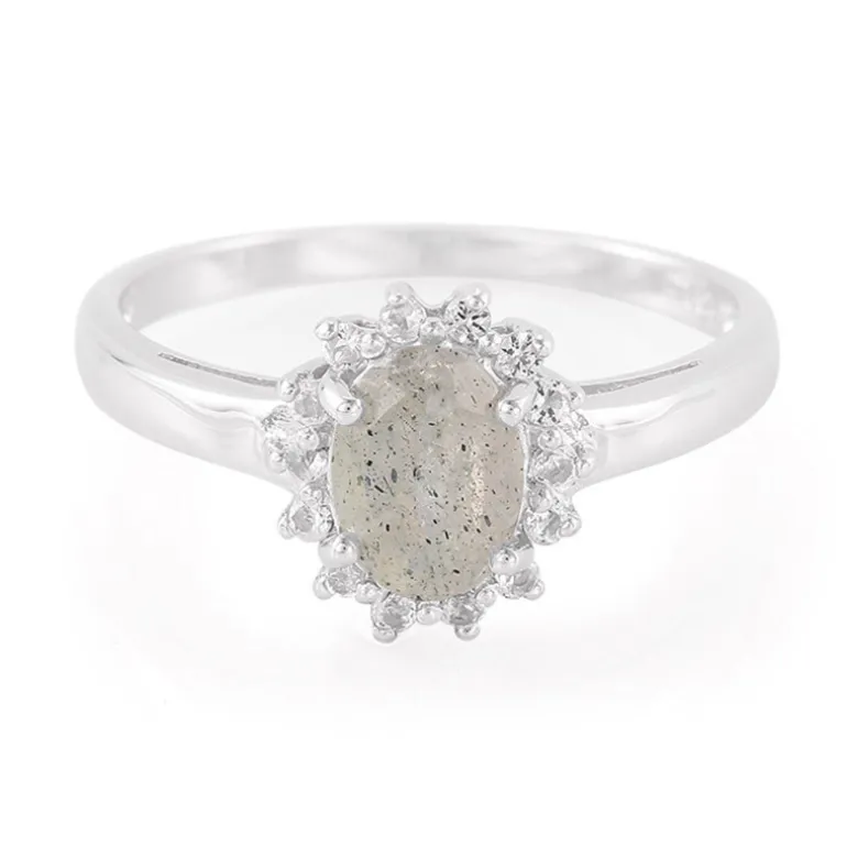 Entdecken Sie die Anziehungskraft unseres exquisiten Rings mit einem ätherisch schimmernden Labradorit aus Madagaskar in der Mitte, umrahmt von strahlend weißen Topasen. Das aus 925er Sterlingsilber gefertigte Schmuckstück mit einem Gesamtgewicht von 0,837 Karat wird durch den oval geschliffenen Labradorit zum Leben erweckt, der einen ruhigen Glanz ausstrahlt. Dieser Ring eignet sich perfekt, um Alltagsoutfits aufzuwerten oder der Abendgarderobe einen Hauch von Raffinesse zu verleihen und ist eine vielseitige Ergänzung für jede Schmucksammlung. Ob als Geschenk für einen geliebten Menschen oder für sich selbst – dieser charmante Ring wird Sie in seinen Bann ziehen.